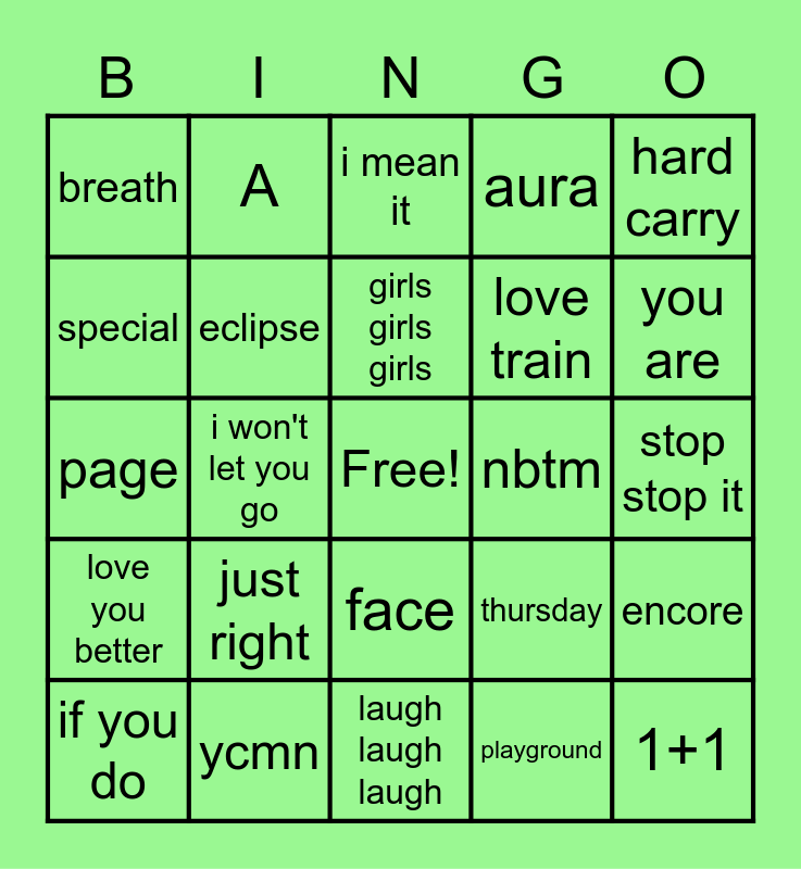This bingo card has a free space and 24 words: just right, ycmn, girls girls girls, if you do, hard carry, breath, special, A, nbtm, face, love train, page, thursday, encore, eclipse, playground, stop stop it, i mean it, you are, i won't let you go, 1+1, love you better, aura and laugh laugh laugh.