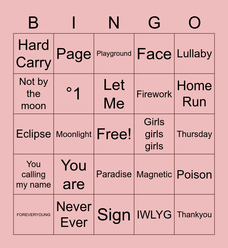 This bingo card has a free space and 24 words: FOREVERYOUNG, You are, Let Me, IWLYG, Lullaby, Hard Carry, Page, Playground, Girls girls girls, Thursday, Eclipse, °1, Magnetic, Poison, Not by the moon, Never Ever, Sign, Face, Home Run, You calling my name, Moonlight, Paradise, Firework and Thankyou.