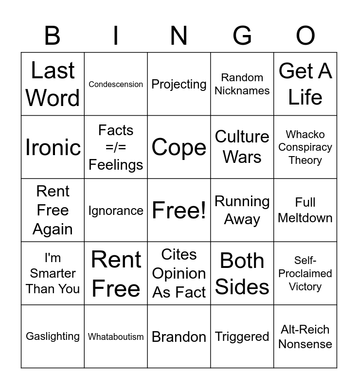 This bingo card has a free space and 24 words: Rent Free, Whataboutism, Cope, Gaslighting, Get A Life, Last Word, Ironic, Condescension, Running Away, Cites Opinion As Fact, Culture Wars, Rent Free Again, Both Sides, Self-Proclaimed Victory, Facts =/= Feelings, Triggered, Full Meltdown, Projecting, Whacko Conspiracy Theory, Ignorance, Alt-Reich Nonsense, I'm Smarter Than You, Random Nicknames and Brandon.