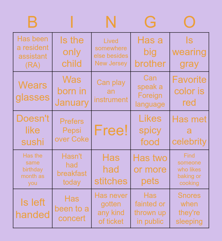 This bingo card has a free space and 24 words: Hasn't had breakfast today, Has been to a concert, Can play an instrument, Is left handed, Is wearing gray, Has been a resident assistant (RA), Wears glasses, Is the only child, Likes spicy food, Has had stitches, Can speak a Foreign language, Doesn't like sushi, Has two or more pets, Find someone who likes baking or cooking, Was born in January, Has fainted or thrown up in public, Has met a celebrity, Lived somewhere else besides New Jersey, Favorite color is red, Prefers Pepsi over Coke, Snores when they're sleeping, Has the same birthday month as you, Has a big brother and Has never gotten any kind of ticket.
