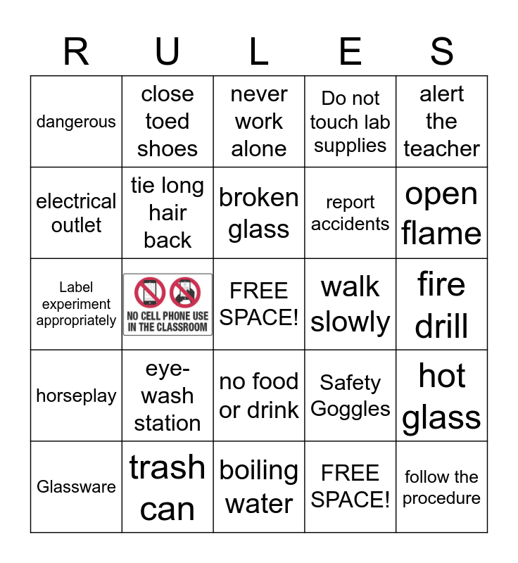 This bingo card has 1 images, a free space and 32 words: avoid injury, Covid Protocols, PPE, horseplay, tie long hair back, alert the teacher, Glassware, close toed shoes, baggy clothing, broken glass, never work alone, clean up after yourself, Proper disposal of chemicals, walk slowly, open flame, trash can, Label experiment appropriately, eye-wash station, Safety Goggles, no food or drink, chemical shower, dangerous, fire drill, boiling water, follow the procedure, Do not touch lab supplies, report accidents, electrical outlet, hot glass, use caution, FREE SPACE! and waft.
