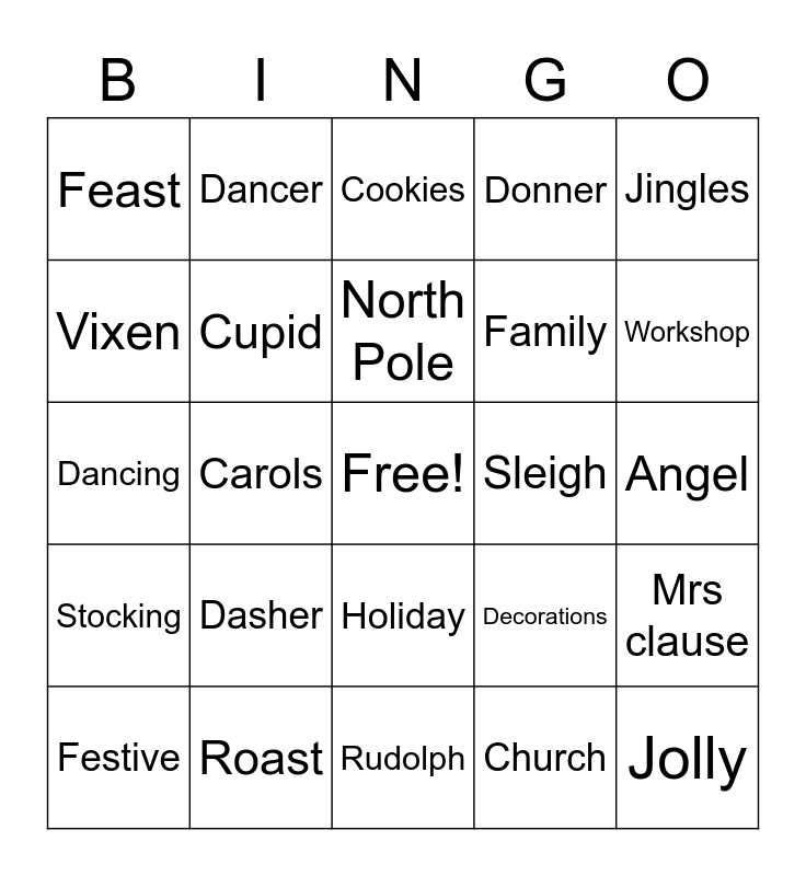 This bingo card has a free space and 46 words: Christmas, Jolly, Joy, Rudolph, Dasher, Blitzen, Dancer, Prancer, Vixen, Comet, Cupid, Donner, Mrs clause, Decorations, Presents, Snow, North Pole, Sleigh, Chimney, Jingles, Carols, Church, Feast, Family, Elves, Workshop, Festive, Season, Holiday, Stocking, Reindeers, Xmas eve, Children, Laughter, Tree, Roast, Angel, Blessings, Candle light, Candy cane, Celebration, Cookies, Dancing, Drinking, Egg nog and Carrots.