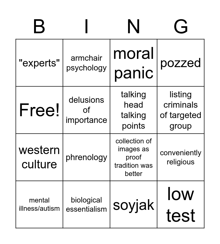 This bingo card has 16 words: biological essentialism, conveniently religious, moral panic, "experts", western culture, armchair psychology, collection of images as proof tradition was better, soyjak, Free!, delusions of importance, mental illness/autism, pozzed, phrenology, listing criminals of targeted group, talking head talking points and low test.