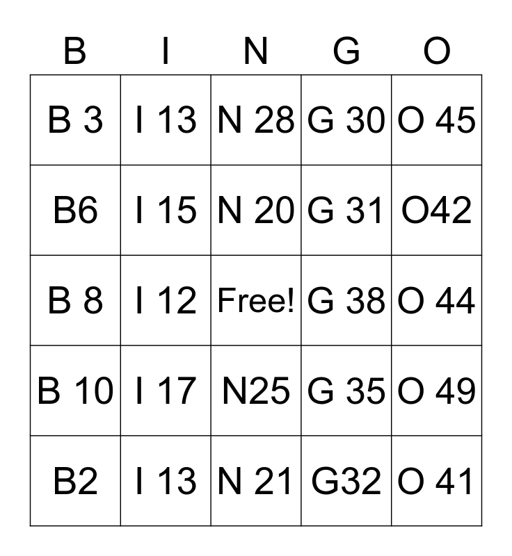 This bingo card has a free space and 24 words: B2, I 17, N 20, G32, O 45, B 3, I 13, N 28, G 38, O 44, B 8, I 15, G 35, O 49, B6, I 13, N 21, G 30, O42, B 10, I 12, N25, G 31 and O 41.