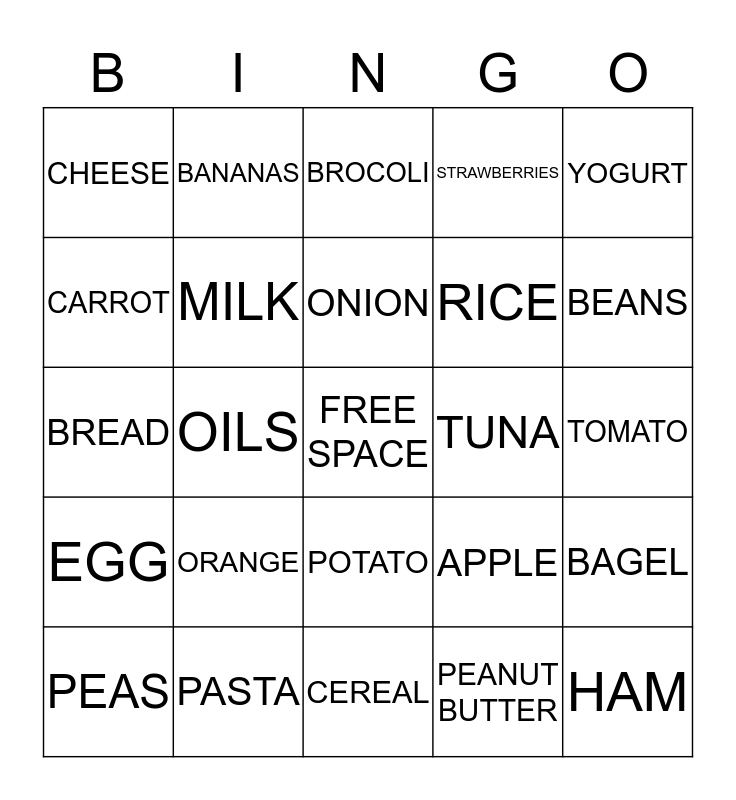 This bingo card has a free space and 24 words: ORANGE, PASTA, ONION, PEAS, YOGURT, CHEESE, CARROT, BANANAS, TUNA, POTATO, RICE, BREAD, APPLE, BAGEL, MILK, PEANUT BUTTER, TOMATO, BROCOLI, BEANS, OILS, HAM, EGG, STRAWBERRIES and CEREAL.
