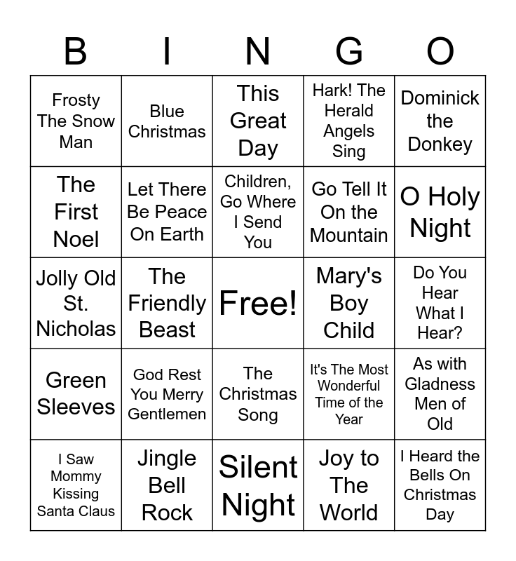 This bingo card has a free space and 65 words: All I Want for Christmas Is My Two Front Teeth, Angels We Have Heard On High, Auld Lang Syne, As with Gladness Men of Old, Away in A Manger, Baby It’s Cold Outside, Blue Christmas, Carol of The Bells, Children, Go Where I Send You, The Chipmunk Song, The Christmas Song, Deck The Halls, Do You Hear What I Hear?, Dominick the Donkey, Feliz Navidad, The First Noel, The Friendly Beast, Frosty The Snow Man, Fum, Fum, Fum, Go Tell It On the Mountain, God Rest You Merry Gentlemen, Green Sleeves, Hark! The Herald Angels Sing, Have Yourself a Merry Little Christmas, Here Comes Santa Claus, Here We Come A-Wassailing, The Holly and The Ivy, Holly Jolly Christmas, I Heard the Bells On Christmas Day, I Saw Three Ships, I Saw Mommy Kissing Santa Claus, I Want a Hippopotamus for Christmas, It Came Upon a Midnight Clear, It's Beginning to Look a Lot Like Christmas, It's The Most Wonderful Time of the Year, Jingle Bell Rock, Jingle Bells, Jolly Old St. Nicholas, Joy to The World, Let It Snow, Let There Be Peace On Earth, The Little Drummer Boy, Mary's Boy Child, O Christmas Tree, O Come, All Ye Faithful, O Come, O Come, Emmanuel, O Holy Night, O Little Town of Bethlehem, Over The River and Through the Woods, Rocking Around the Christmas Tree, Rudolf The Red-Nosed Reindeer, Run, Run, Rudolf, Santa Claus Is Coming to Town, Silent Night, Silver Bells, Sleigh Ride, The Twelve Days of Christmas, This Great Day, Up On the Housetop, We Three Kings, We Wish You a Merry Christmas, What Child Is This?, White Christmas, Winter Wonderland and Wonderful Christmastime.