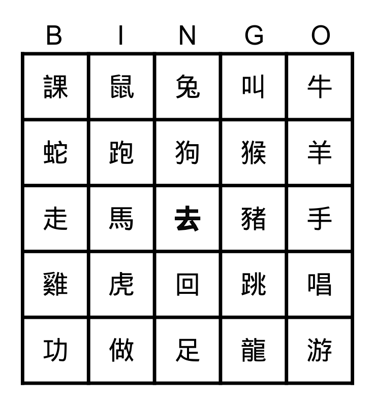This bingo card has a free space and 24 words: 虎, 做, 狗, 功, 牛, 課, 蛇, 鼠, 豬, 回, 猴, 走, 跳, 唱, 跑, 龍, 手, 兔, 羊, 馬, 游, 雞, 叫 and 足.