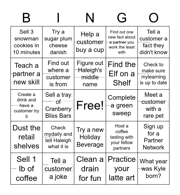 This bingo card has 15 images, a free space and 24 words: Check mydaily and tell Haleigh what it is, Tell a customer a joke, Figure out Haleigh's middle name, Sell 1 lb of coffee, Tell a customer a fact they didn't know, Sell 3 snowman cookies in 10 minutes, Teach a partner a new skill, Try a sugar plum cheese danish, Complete a green sweep, Try a new Holiday Beverage, Find the Elf on a Shelf, Create a drink and have a customer try it, Host a coffee tasting with your fellow partners, Sign up for a Partner Network, Find out where a customer is from, Practice your latte art, Meet a customer with a rare pet, Help a customer buy a cup, Check to make sure mylearning is up to date, Sell a tray of Cranberry Bliss Bars, What year was Kyle born?, Dust the retail shelves, Find out one new fact about a partner you work the least with and Clean a drain for fun.