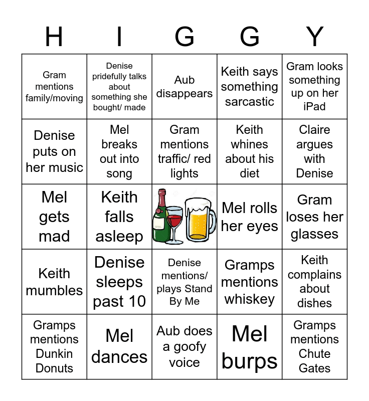 This bingo card has a free space and 65 words: Denise cackles, Keith breaks a glass/ it's mentioned, Denise defends Murphy's weight, Keith complains about dishes, Gram says "I'm not a ___ person.", Denise volunteers Keith to do something, Denise pridefully talks about something she bought/ made, Keith spills gravy/ it's mentioned, Gram mentions traffic/ red lights, Gram doubts her ability to do something, Denise mentions/ plays Stand By Me, Denise explains something in great depth, Gram loses her glasses, Gram looks something up on her iPad, Denise gets angry at a game, Denise puts on her music, Keith falls asleep, Gram mentions family/moving, Gram brings newspaper clippings, Keith whines about his diet, Denise sleeps past 10, Keith mumbles, Keith says something sarcastic, Keith farts, Gram says "just a taste/ just a sliver", Keith opens the snack cabinet, Gramps tells an off-color joke, Gramps makes a political comment, Gramps mentions Chute Gates, Gramps grunts in disagreement, Gramps mentions Dunkin Donuts, Gramps says "oh jeeze/ oh cripe", Gramps brings up boyscouts, Gramps gets antsy to leave, Gramps mentions whiskey, Mel dances, Mel asks someone to dance with her, Mel gets mad, Mel burps, Mel insists on playing games, Mel breaks out into song, Mel volunteers Aub to do something, Mel rolls her eyes, Claire tells people to be quiet, Claire is late/ leaves, Claire talks about stuff she bought at work, Claire argues with Denise, Claire wears a robe, Claire mentions she is cold, Claire looks pissed, Claire says "don't let my food touch", Aub plays on his phone, Aub drinks a seltzer, Aub does a goofy voice, Aub gives things funny names, Aub looks at Mel with love, Aub shrugs, Aub disappears, Dog(s) runs away, Murphy eats people food, someone mentions Aub's feet, size, eating, someone points out Button's tongue, someone mentions Hank's beauty, Pictionary is brought up and Old vacation is brought up.