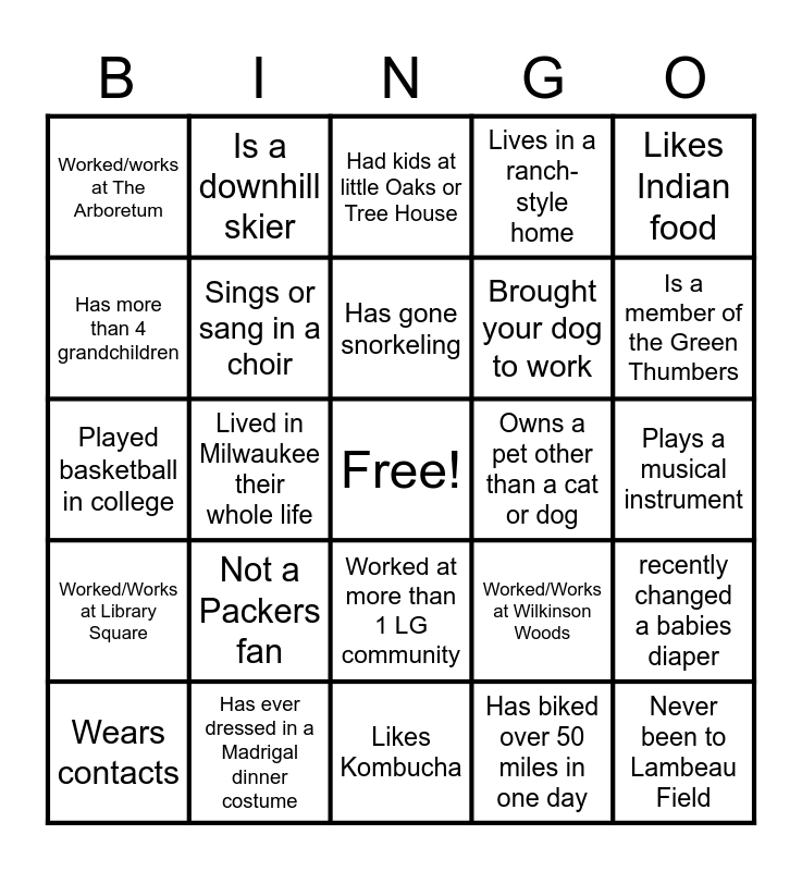 This bingo card has a free space and 73 words: Has been kayaking, Worked/works at Hart Park Square, Worked/works at The Arboretum, Worked/works at Howard Village, Worked/works at Laurel Oaks, Worked/works at Layton Terrace, Worked/Works at Library Square, Worked/works at Oak Hill Terrace, Worked/Works at Wilkinson Woods, Has gone skydiving, Worked in Healthcare for 5 years, Has a nursing degree, Sings or sang in a choir, Plays a musical instrument, Has gone snow shoeing, Is a downhill skier, Likes Kombucha, Has more than 4 grandchildren, Has or is in a book club, Owns a pet other than a cat or dog, Has gone snorkeling, Lives in a ranch-style home, Likes Indian food, Is left handed, Wears contacts, Likes to listen to podcasts, Has a pet that Is not a cat, dog or fish, Has not missed a state fair in the last 10 years, Has ever been a guest on a podcast, Has met a celebrity, Has ever dressed in a Madrigal dinner costume, Played a sport in high school, Has had surgery, Was not born in Wisconsin, Lived in Milwaukee their whole life, Been to a Milwaukee Bucks game, Has never tailgated before a game, Been to a Brewers game, Never been to Lambeau Field, Has never broken a bone, Has biked over 50 miles in one day, Not a Packers fan, Has seen a play recently, Drives a Toyota, Ran a marathon, Brought your dog to work, Had kids at little Oaks or Tree House, Made and kept a New Years Resolution, Played football in college, Played basketball in college, Dressed up this Halloween, Drives a Harley, Driven across the country, Married for 10 years or more, Speaks 3 languages, Been to a concert at Summerfest, Has owned a convertible, Worked at more than 1 LG community, Has four or more siblings, Immediate family of 5 or more, Has not missed a State Fair in last 10 years, Completed a jigsaw puzzle in the last week, Worked at LG more than 25 years, Is a member of the Green Thumbers, Doesn't wear a watch, Not afraid of spiders, Has milked a cow, Never used a rotary phone, recently changed a babies diaper, Has a hidden tattoo, Performed a random act of kindness recently, Has a birthday the same month as you and Has green eyes.