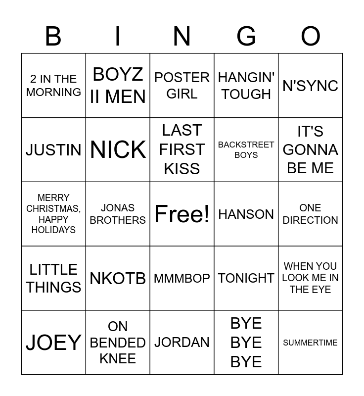 This bingo card has a free space and 24 words: NKOTB, ON BENDED KNEE, LAST FIRST KISS, JOEY, N'SYNC, 2 IN THE MORNING, JUSTIN, BOYZ II MEN, HANSON, MMMBOP, BACKSTREET BOYS, MERRY CHRISTMAS, HAPPY HOLIDAYS, TONIGHT, WHEN YOU LOOK ME IN THE EYE, NICK, BYE BYE BYE, ONE DIRECTION, POSTER GIRL, IT'S GONNA BE ME, JONAS BROTHERS, SUMMERTIME, LITTLE THINGS, HANGIN' TOUGH and JORDAN.