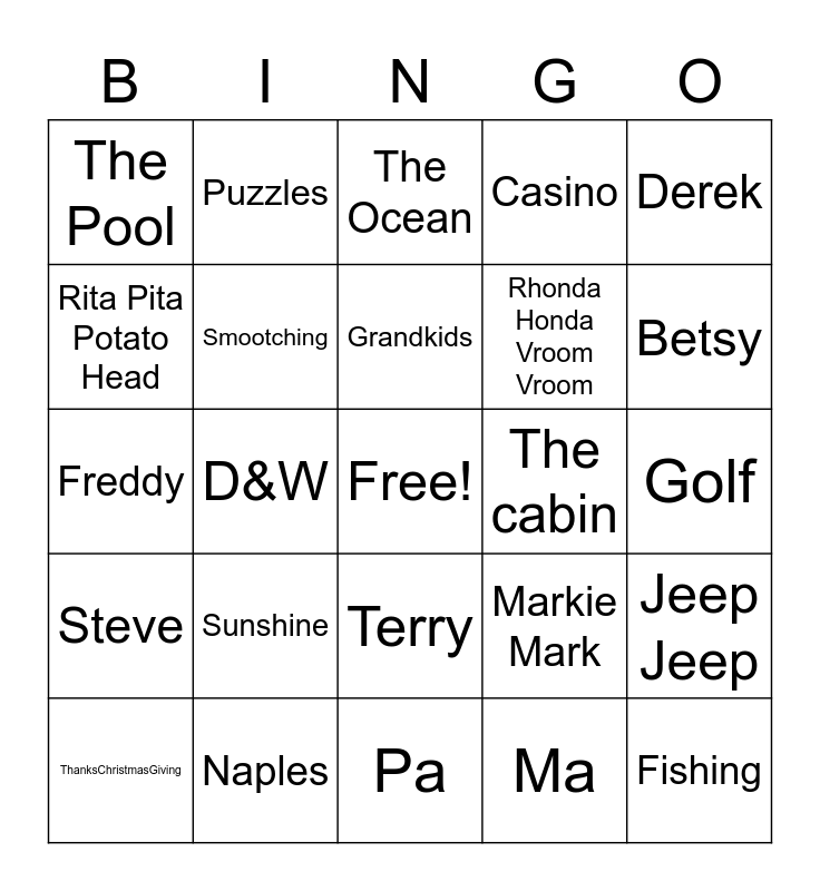 This bingo card has a free space and 29 words: ThanksChristmasGiving, Family, D&W, Bekins Auto, The Pool, The Ocean, Smootching, Sunshine, The cabin, Naples, Golf, Fishing, Pa, Ma, Betsy, Paula, Terry, Steve, Derek, Freddy, Markie Mark, Shelley Belly, Rhonda Honda Vroom Vroom, Rita Pita Potato Head, Casino, Puzzles, Jeep Jeep, Grandkids and Great Grandkids.