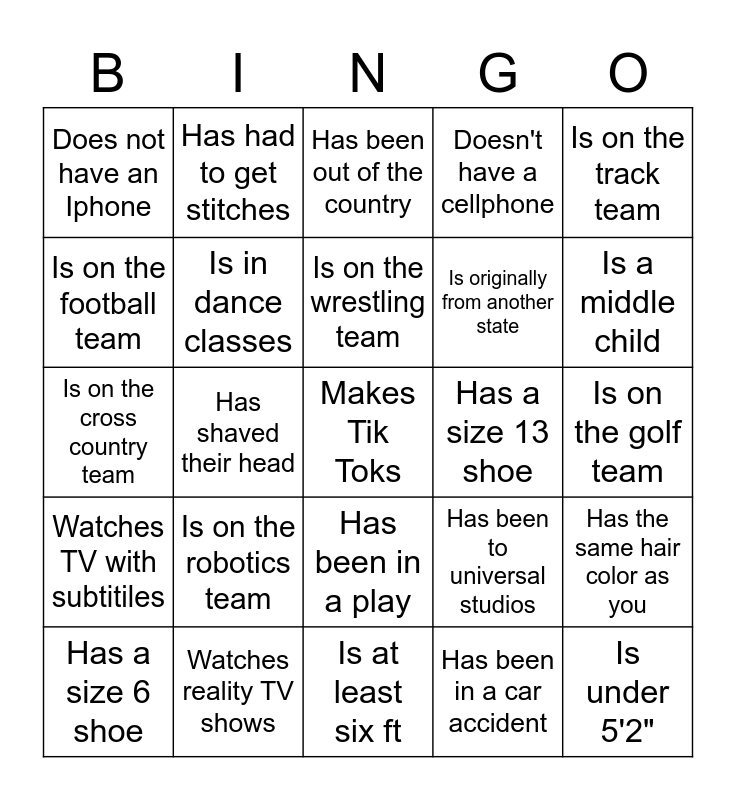 This bingo card has 80 words: Has more than 3 siblings, Is an only child, Has been out of the country, Has never left Michigan, Has never moved houses, Has a tattoo, Has a job, Has an older brother, Has an exotic pet, Has more than 2 dogs, Is allergic to something, Has never gotten their nails done professionally, Doesn't have a cellphone, Does not have an Iphone, Is on the basketball team, Is on the football team, Is on the volleyball team, Is on the robotics team, Is on the baseball team, Is on the golf team, Is on a hockey team, Is on the track team, Is on the cross country team, Is on the wrestling team, Is in dance classes, Has a unique talent, Can roll their "r's", Is vegetarian, Is vegan, Is the youngest child, Is a middle child, Is the oldest child, Is at least six ft, Is under 5'2", Has a size 6 shoe, Has a size 13 shoe, Plays video games, Watches anime, Watches Tik Tok, Makes Tik Toks, Streams on Twitch, Would rather stay home than go out, Would rather be out with friends than stay home, Speaks a 2nd language, Has broken a bone, Has had to get stitches, Is an aunt or uncle, Uses a planner, Has participated in a 5K, Has the same eye color as you, Has the same hair color as you, Has shaved their head, Has been to universal studios, Has been to Disney world or land, Has the same birth month as you, Always has a clean room, Always has a messy room, Plays an instrament, Is in chior, Has been in a play, Is originally from another state, Has moved houses more than once, Is a sophomore, Is a junior, Is a senior, Has a car, Has never been in a care accident, Has never dyed their hair, Has cut their own hair, Has never been to Gull Meadows, Watches TV with subtitiles, Watches reality TV shows, Listens to country music, Listens to Rock music, Listens to Rap music, Doesn't use Tik Tok, Has been in a car accident, Wears Glasses, Wears contacts and Has had to use crutches.