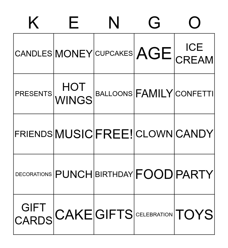 This bingo card has a free space and 26 words: BIRTHDAY, CELEBRATION, BALLOONS, CAKE, ICE CREAM, CANDLES, PRESENTS, MONEY, CANDY, FOOD, FAMILY, FRIENDS, PARTY, GIFT CARDS, MUSIC, WISH, AGE, DECORATIONS, CUPCAKES, TOYS, CONFETTI, GIFTS, CLOWN, PUNCH, HOT WINGS and MEATBALLS.