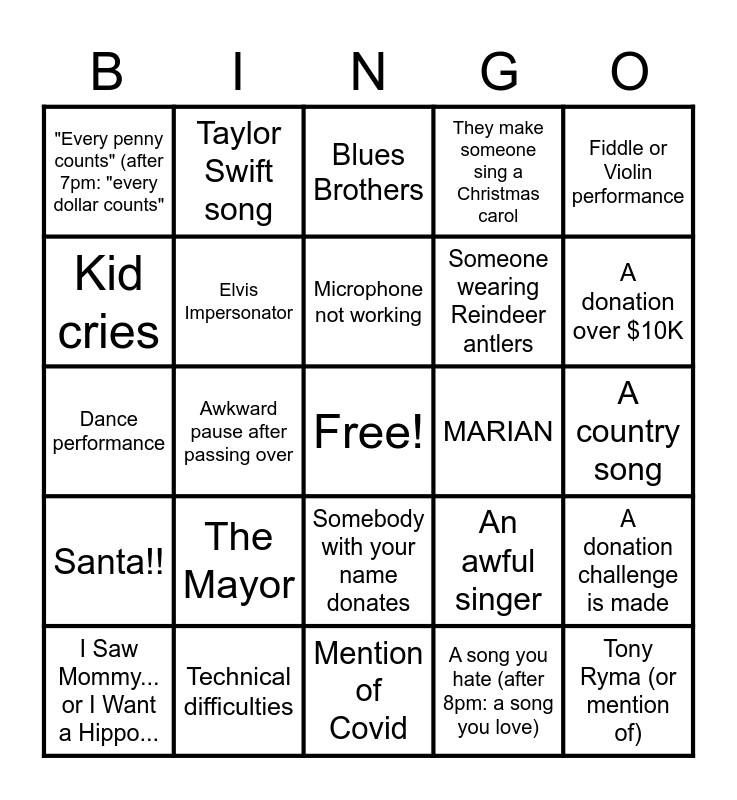 This bingo card has a free space and 30 words: Technical difficulties, A child freezes up, Awkward pause after passing over, "The reason for the season", "Every penny counts" (after 7pm: "every dollar counts", Blues Brothers, Elvis Impersonator, Somebody with your name donates, MARIAN, Mention of Covid, A country song, Tony Ryma (or mention of), A song you hate (after 8pm: a song you love), Someone you know (excluding Marian), A donation over $10K, A donation under $10, An awful singer, Santa!!, The Mayor, Fiddle or Violin performance, Dance performance, Martial Arts, Taylor Swift song, Someone wearing Reindeer antlers, Kid cries, They make someone sing a Christmas carol, A donation challenge is made, I Saw Mommy... or I Want a Hippo..., Microphone not working and Camera on the wrong person.