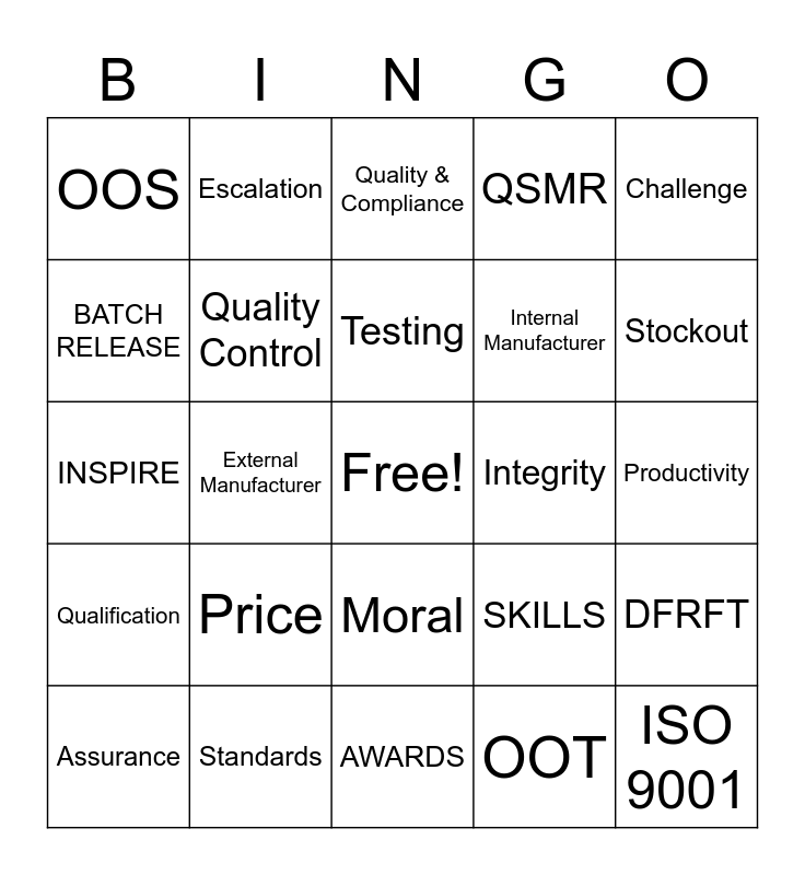 This bingo card has a free space and 28 words: DFRFT, PROCESS, Internal Manufacturer, OOT, BATCH RELEASE, Quality & Compliance, Escalation, Qualification, Integrity, Assurance, INSPIRE, QSMR, Standards, AWARDS, Stockout, Ethics, Price, Quality Control, Testing, Moral, OOS, REPACKAGERS, ISO 9001, External Manufacturer, Productivity, SKILLS, Challenge and PLAN.