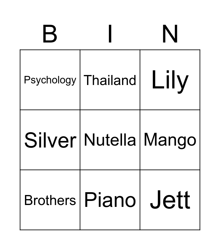 This bingo card has 27 words: Free!, Samuel, Jett, Elizabeth, Mango, Lily, Thailand, Spanish, Shaun, Golf, Rabbit, Silver, Gym West, Melbourne, Tabor, Prides, Brothers, Piano, World Vision, Psychology, Western, Immanuel, Ferg, Rachel, Vietnamese, Nutella and Meningitis.