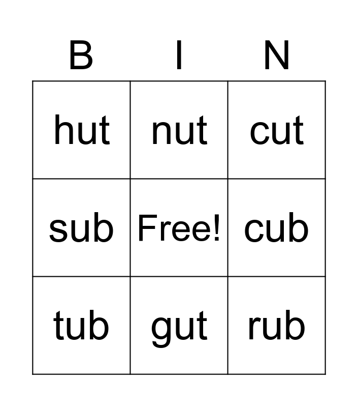 This bingo card has a free space and 8 words: cub, cut, nut, tub, hut, rub, sub and gut.