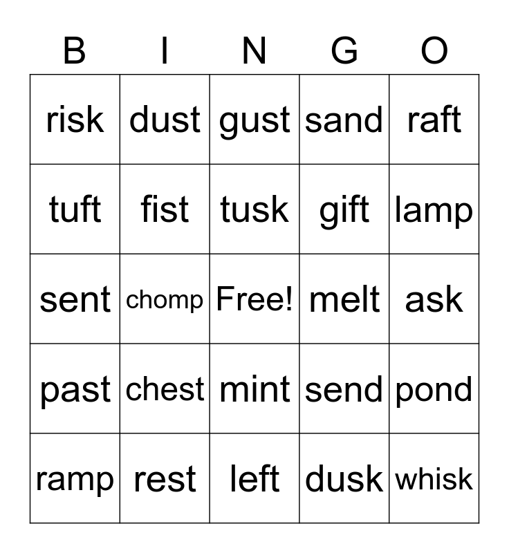 This bingo card has a free space and 24 words: chest, rest, tusk, ramp, raft, risk, tuft, dust, melt, mint, gift, sent, send, pond, fist, dusk, ask, gust, lamp, chomp, whisk, past, sand and left.