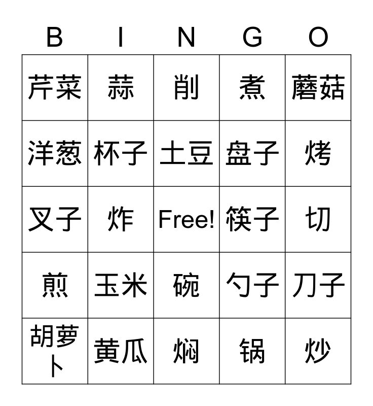 This bingo card has a free space and 24 words: 玉米, 黄瓜, 土豆, 胡萝卜, 蘑菇, 芹菜, 洋葱, 蒜, 筷子, 碗, 盘子, 叉子, 勺子, 刀子, 杯子, 锅, 切, 削, 烤, 炸, 炒, 煎, 煮 and 焖.
