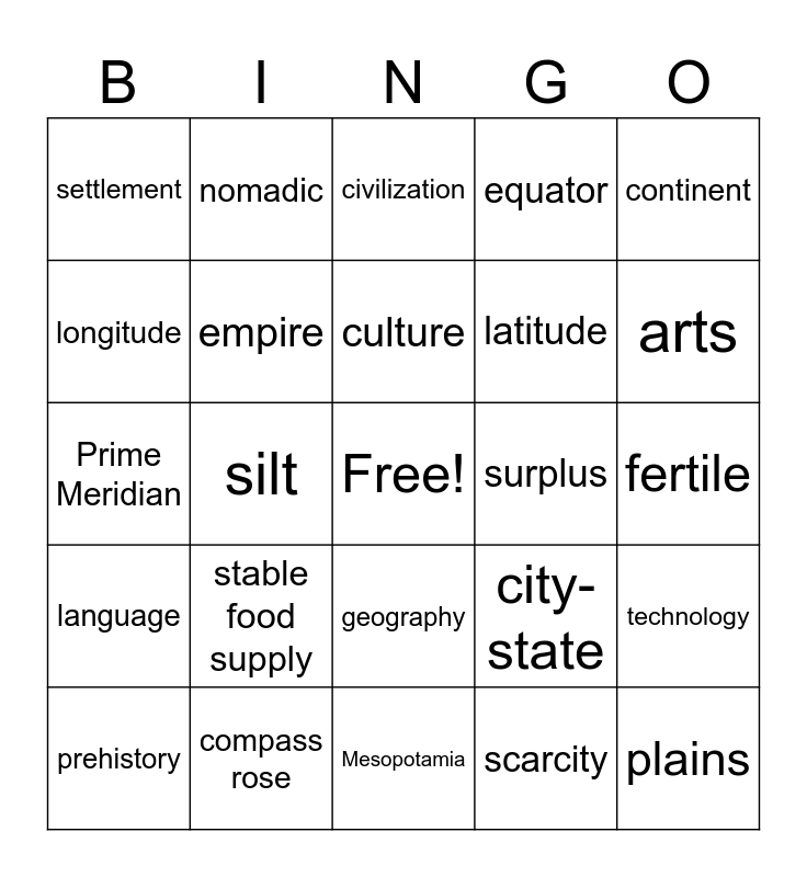 This bingo card has a free space and 31 words: Mesopotamia, irrigation, silt, levee, settlement, civilization, empire, city-state, surplus, scarcity, fertile, plains, religion, government, arts, social structure, technology, stable food supply, language, geography, continent, direction, prehistory, nomadic, latitude, longitude, equator, Prime Meridian, compass rose, culture and migration.