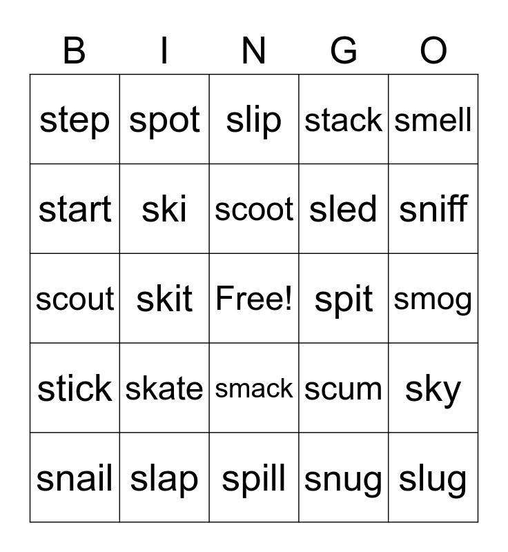 This bingo card has a free space and 24 words: skate, slap, scoot, snail, smell, step, start, spot, spit, smack, sled, scout, scum, sky, ski, snug, smog, slip, sniff, skit, slug, stick, stack and spill.