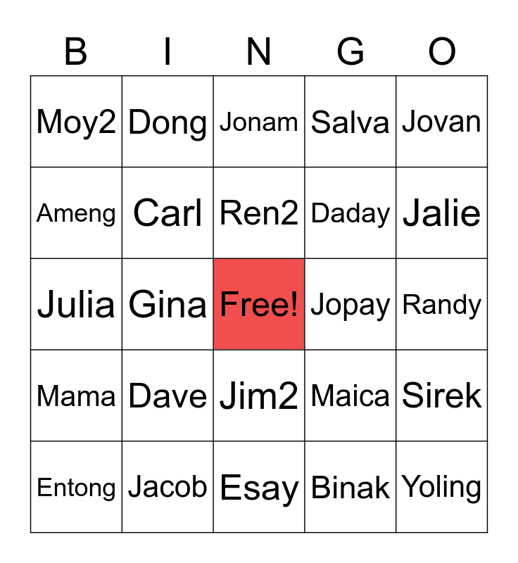 This bingo card has a free space and 24 words: Dave, Jacob, Ren2, Entong, Jovan, Moy2, Ameng, Dong, Jopay, Jim2, Daday, Julia, Maica, Sirek, Carl, Binak, Randy, Jonam, Jalie, Gina, Yoling, Mama, Salva and Esay.