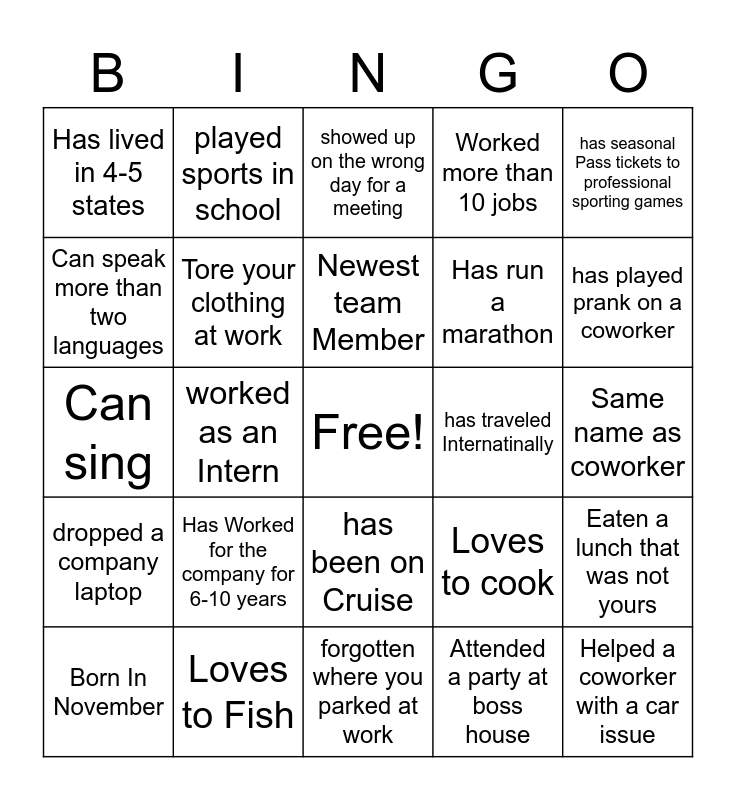 This bingo card has a free space and 24 words: Has Worked for the company for 6-10 years, Loves to Fish, Newest team Member, Born In November, has seasonal Pass tickets to professional sporting games, Has lived in 4-5 states, Can speak more than two languages, played sports in school, has traveled Internatinally, has been on Cruise, Has run a marathon, Can sing, Loves to cook, Eaten a lunch that was not yours, Tore your clothing at work, Attended a party at boss house, Same name as coworker, showed up on the wrong day for a meeting, has played prank on a coworker, worked as an Intern, Helped a coworker with a car issue, dropped a company laptop, Worked more than 10 jobs and forgotten where you parked at work.
