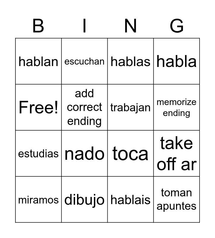 This bingo card has 16 words: dibujo, take off ar, hablas, hablan, estudias, escuchan, toca, hablais, Free!, add correct ending, miramos, habla, nado, memorize ending, trabajan and toman apuntes.