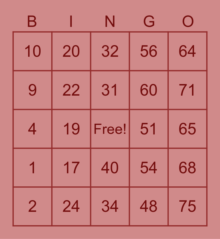 This bingo card has a free space and 24 words: 2, 17, 31, 48, 64, 10, 20, 32, 51, 65, 4, 22, 54, 68, 9, 24, 34, 56, 71, 1, 19, 40, 60 and 75.