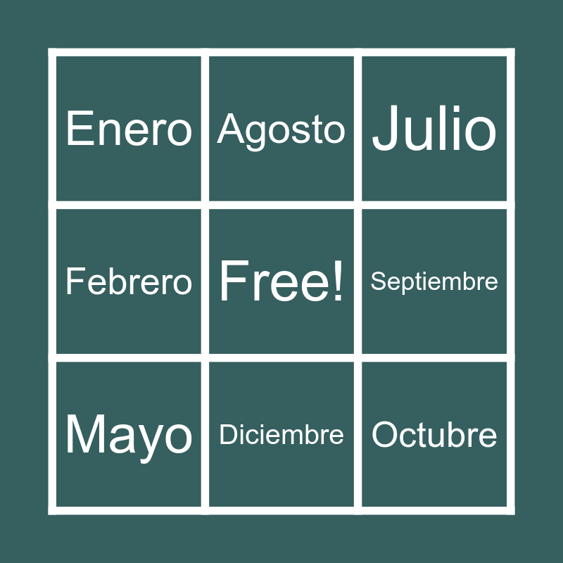 This bingo card has a free space and 12 words: Junio, Marzo, Octubre, Septiembre, Agosto, Julio, Diciembre, Abril, Enero, Febrero, Mayo and Noviembre.