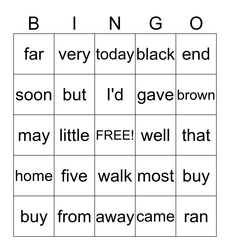 This bingo card has a free space and 24 words: five, from, I'd, buy, end, far, soon, very, well, walk, gave, may, most, buy, but, came, that, today, brown, little, ran, home, black and away.