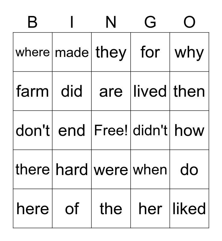 This bingo card has a free space and 24 words: hard, of, are, here, why, where, farm, made, didn't, were, lived, don't, when, do, did, her, how, they, then, end, liked, there, for and the.