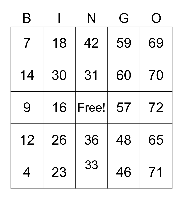 This bingo card has a free space and 24 words: 4, 26, 31, 46, 69, 7, 18, 42, 57, 72, 9, 30, 48, 65, 14, 23, 33, 59, 70, 12, 16, 36, 60 and 71.