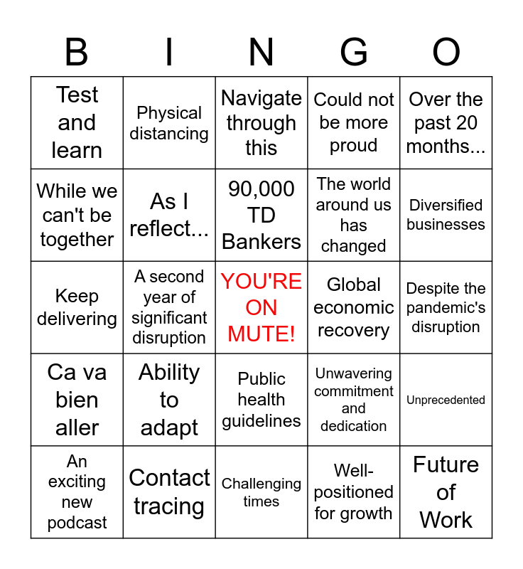 This bingo card has a free space and 59 words: Now more than ever, Contact tracing, Today and in the future, Ca va bien aller, Well-positioned for growth, Confinement / deconfinement, As I reflect..., No crystal ball, The world around us has changed, Virtual environment, Could not be more proud, Navigate the "new normal", While we can't be together, Work-life balance, Nothing short of amazing, Test and learn, Future of Work, Over the past 20 months..., Health and safety measures, 90,000 TD Bankers, Global economic recovery, Navigate through this, An exciting new podcast, Unprecedented, Pivot, Standing tall, Critically important, Period of uncertainty and disruption, Diversified businesses, Virtual happy hour, Return to office, Hard stop, Move the needle, Distanciation sociale, Physical distancing, Hybrid, Well-positioned for the future, A second year of significant disruption, Pre-pandemic, Keep delivering, Profound impact, Ability to adapt, Despite the pandemic's disruption, Economies will begin to reopen, Challenging macroeconomic environment, Your hard work and resilience, Support one another, Build the Better Bank, Public health guidelines, Challenging times, Emerge stronger and more resilience, COVID-19, We need to send a note, Well-being, Together we will overcome, Unwavering commitment and dedication, Colleagues, customers, communities, In this time of significant change and Incredibly excited by what lies ahead.