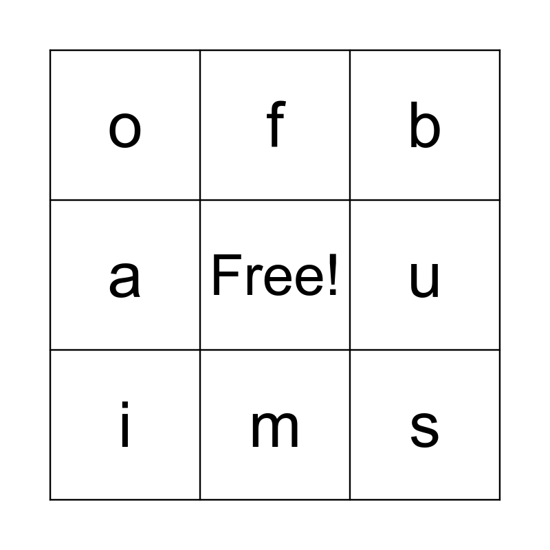 This bingo card has a free space and 8 words: u, b, f, i, o, s, a and m.