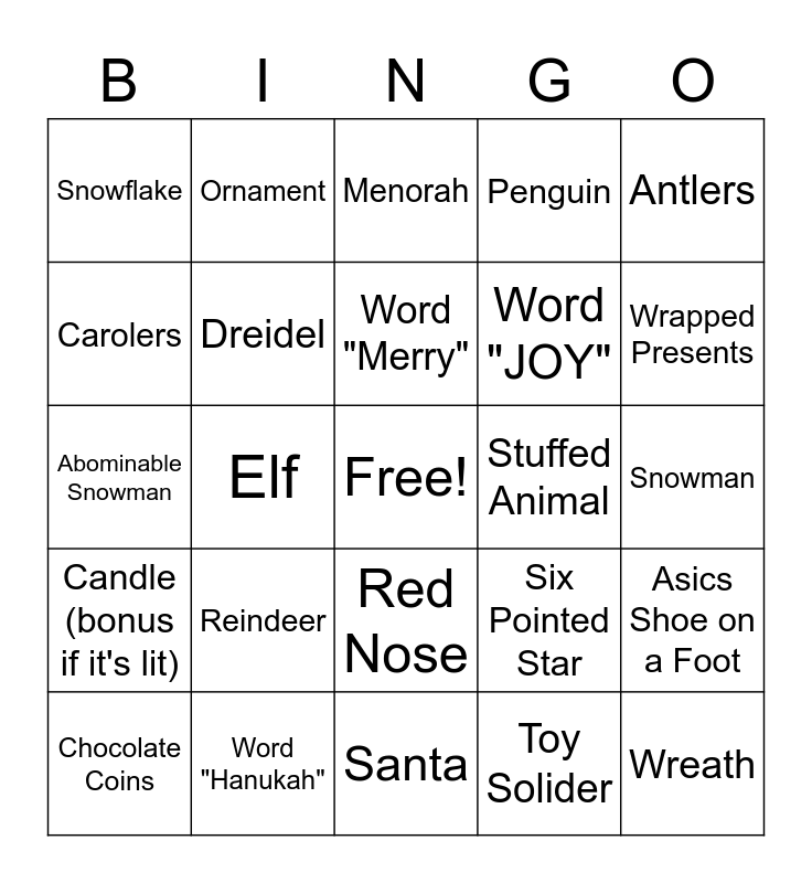 This bingo card has a free space and 31 words: Santa, Mrs. Claus, Elf, Sleigh, Snowflake, Menorah, Dreidel, Six Pointed Star, Stuffed Animal, Toy Solider, Snowman, Wreath, Red Bow, Christmas Tree, Wrapped Presents, Word "Asics", Asics Shoe on a Foot, Reindeer, Candle (bonus if it's lit), Red Nose, Antlers, Candy Cane, Chocolate Coins, Ornament, Word "JOY", Carolers, Penguin, Abominable Snowman, Word "Hanukah", Word "Merry" and Reindeer.