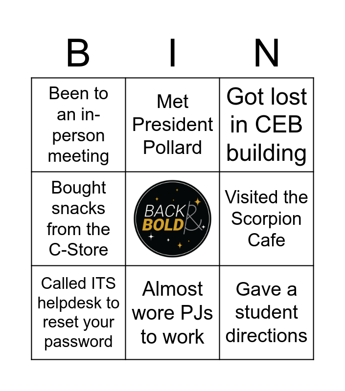 This bingo card has a free space and 8 words: Visited the Scorpion Cafe, Got lost in CEB building, Met President Pollard, Called ITS helpdesk to reset your password, Been to an in-person meeting, Gave a student directions, Bought snacks from the C-Store and Almost wore PJs to work.