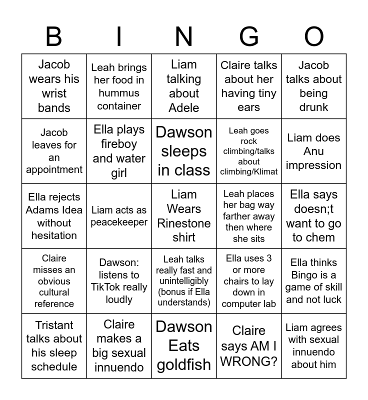 This bingo card has a free space and 25 words: Dawson: listens to TikTok really loudly, Dawson Eats goldfish, Dawson sleeps in class, Tristant talks about his sleep schedule, Jacob talks about being drunk, Jacob wears his wrist bands, Jacob leaves for an appointment, Leah brings her food in hummus container, Leah places her bag way farther away then where she sits, Leah talks really fast and unintelligibly (bonus if Ella understands), Leah goes rock climbing/talks about climbing/Klimat, Ella rejects Adams Idea without hesitation, Ella uses 3 or more chairs to lay down in computer lab, Ella thinks Bingo is a game of skill and not luck, Ella plays fireboy and water girl, Ella puts headphones on and ignores us, Ella says doesn;t want to go to chem, Liam talking about Adele, Liam does Anu impression, Liam acts as peacekeeper, Liam agrees with sexual innuendo about him, Claire makes a big sexual innuendo, Claire misses an obvious cultural reference, Claire talks about her having tiny ears and Claire says AM I WRONG?.