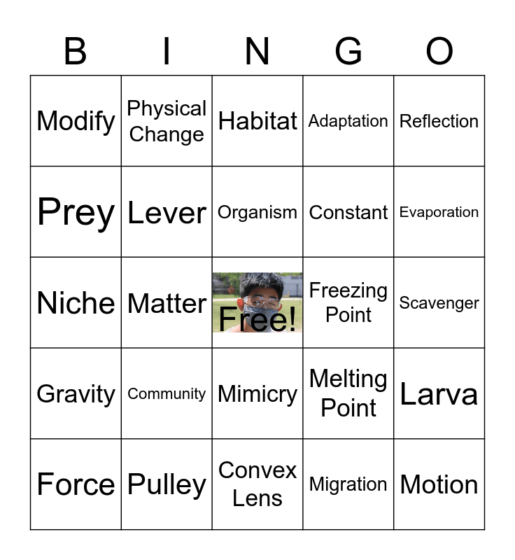 This bingo card has a free space and 88 words: Thrive, Survive, Mimicry, Producer, Parasitism, Herbivore, Reproduction, Population, Pupa, Consumer, Food Web, Egg, Larva, Scavenger, Perish, Organism, Predator, Carnivore, Omnivore, Decomposer, Camouflage, Nymph, Niche, Adult, Migration, Food Chain, Photosynthesis, Metamorphosis, Biome, Biotic Factor, Habitat, Adaptation, Hibernation, Species, Community, Prey, Modify, Oxygen Carbon Dioxide Cycle, Condensation, Evaporation, Matter, Volume, Change, Melting Point, Freezing Point, Melting, Mixture, Mass, Ingredients, Constant, Chemical Change, Solution, Boiling Point, Magnetism, Dissolving, Physical Properties, Gravity, Physical Change, Freeze, Heredity, Offspring, Trait, Inherited Trait, Vibration, Pitch, Pulley, Inclined Plane, Lever, Force, Motion, Position, Friction, Light, Reflection, Concave Lens, Lens, Light Ray, Refraction, Convex Lens, Energy, Heat, Solar Energy, Electricity, Conduction, Insulation, Electric Circuit, Electric Current and Transfer.