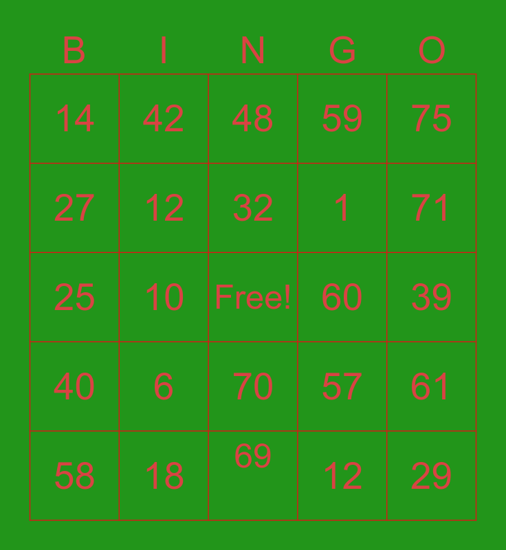 This bingo card has a free space and 24 words: 6, 18, 32, 58, 75, 14, 27, 42, 60, 70, 1, 25, 57, 61, 12, 12, 39, 48, 71, 10, 29, 40, 59 and 69.