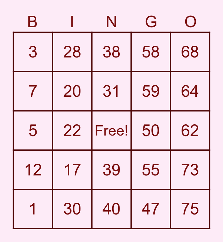This bingo card has a free space and 24 words: 1, 17, 31, 47, 68, 3, 28, 38, 50, 62, 5, 20, 55, 73, 7, 30, 40, 58, 64, 12, 22, 39, 59 and 75.