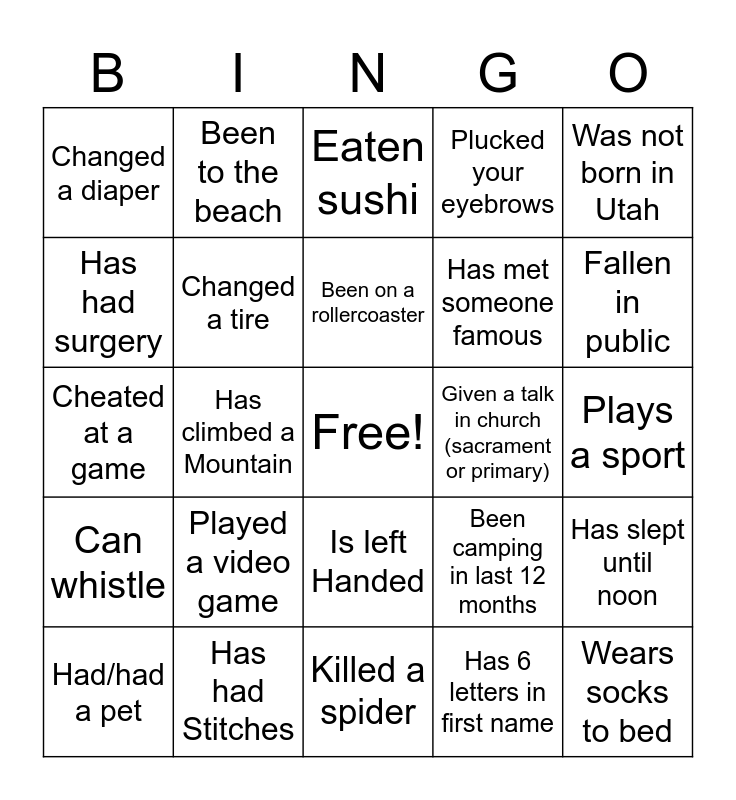 This bingo card has a free space and 29 words: Had/had a pet, Been stung by a bee, Has climbed a Mountain, Does not wear glasses or contacts, Changed a diaper, Eaten sushi, Changed a tire, Played a video game, Given a talk in church (sacrament or primary), Has had Stitches, Plays a sport, Wears socks to bed, Killed a spider, Has 6 letters in first name, Fallen in public, Has freckles, Is left Handed, Can whistle, Was not born in Utah, Cheated at a game, Been camping in last 12 months, Had/has braces, Has met someone famous, Has had surgery, Plucked your eyebrows, Been to the beach, Has slept until noon, Been on a rollercoaster and Can play an instrument.