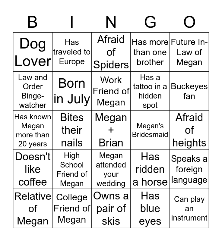 This bingo card has a free space and 24 words: High School Friend of Megan, College Friend of Megan, Work Friend of Megan, Relative of Megan, Future In-Law of Megan, Dog Lover, Law and Order Binge-watcher, Has traveled to Europe, Megan's Bridesmaid, Megan attended your wedding, Has a tattoo in a hidden spot, Has known Megan more than 20 years, Has ridden a horse, Speaks a foreign language, Born in July, Has blue eyes, Afraid of heights, Afraid of Spiders, Buckeyes fan, Bites their nails, Can play an instrument, Doesn't like coffee, Has more than one brother and Owns a pair of skis.
