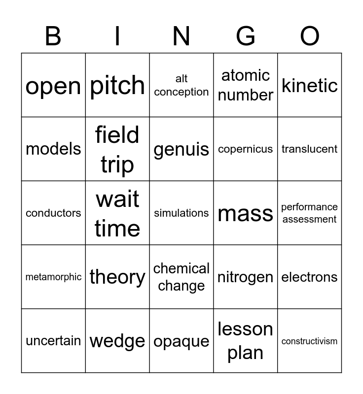 This bingo card has a free space and 24 words: theory, wedge, genuis, uncertain, kinetic, open, models, pitch, mass, chemical change, copernicus, conductors, nitrogen, electrons, field trip, lesson plan, performance assessment, alt conception, translucent, wait time, constructivism, metamorphic, atomic number and opaque.