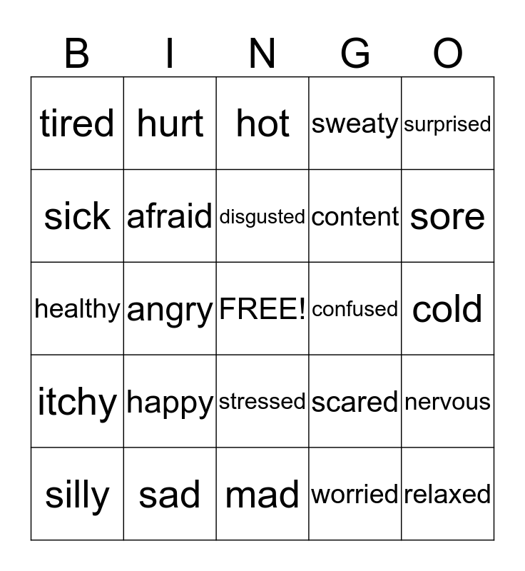 This bingo card has a free space and 24 words: happy, sad, disgusted, silly, surprised, tired, sick, hurt, confused, stressed, content, healthy, scared, nervous, afraid, worried, cold, hot, sore, angry, relaxed, itchy, sweaty and mad.