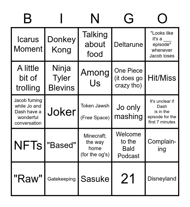 This bingo card has a free space and 24 words: "Based", Gatekeeping, Among Us, "Raw", "Looks like it's a ___ episode" whenever Jacob loses, Icarus Moment, A little bit of trolling, Donkey Kong, Jo only mashing, Minecraft; the way home (for the og's), One Piece (it does go crazy tho), Jacob fuming while Jo and Dash have a wonderful conversation, Welcome to the Bald Podcast, Complain-ing, Ninja Tyler Blevins, 21, It's unclear if Dash is in the episode for the first 7 minutes, Talking about food, Hit/Miss, Joker, Disneyland, NFTs, Deltarune and Sasuke.