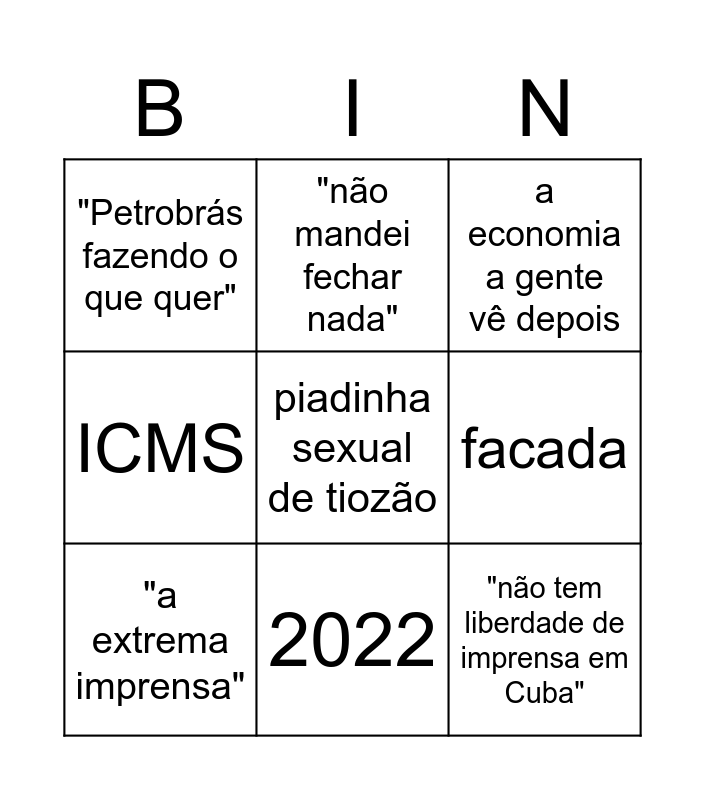 This bingo card has 9 words: "a extrema imprensa", a economia a gente vê depois, "não mandei fechar nada", ICMS, "Petrobrás fazendo o que quer", facada, piadinha sexual de tiozão, "não tem liberdade de imprensa em Cuba" and 2022.