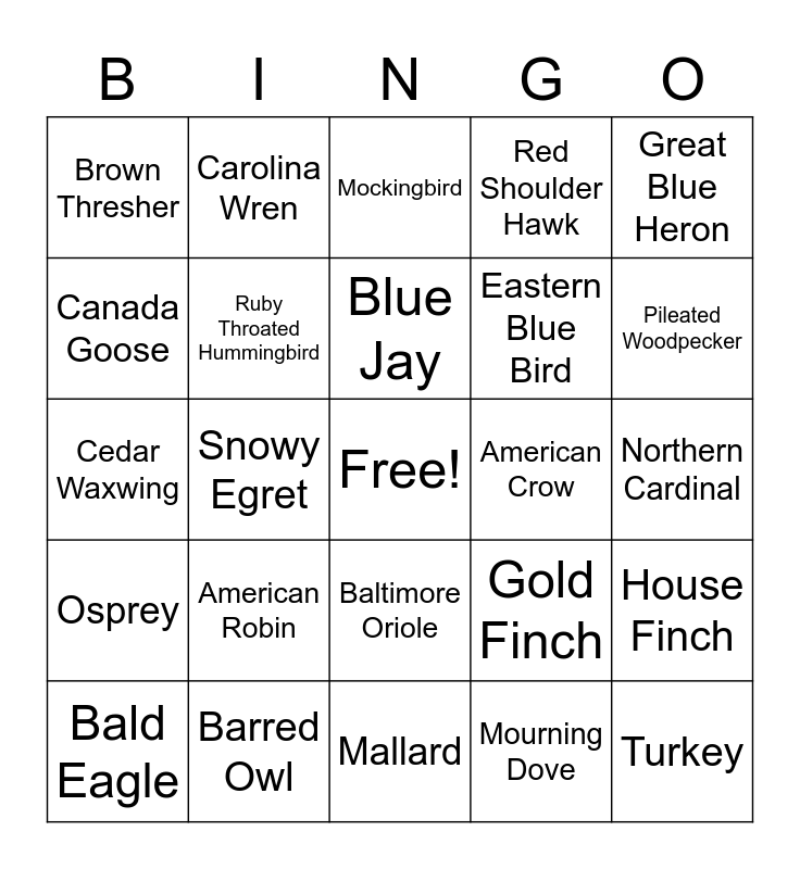 This bingo card has a free space and 24 words: American Robin, Barred Owl, Blue Jay, Bald Eagle, Great Blue Heron, Brown Thresher, Canada Goose, Carolina Wren, American Crow, Baltimore Oriole, Eastern Blue Bird, Cedar Waxwing, Gold Finch, House Finch, Ruby Throated Hummingbird, Mourning Dove, Northern Cardinal, Mockingbird, Pileated Woodpecker, Snowy Egret, Turkey, Osprey, Red Shoulder Hawk and Mallard.