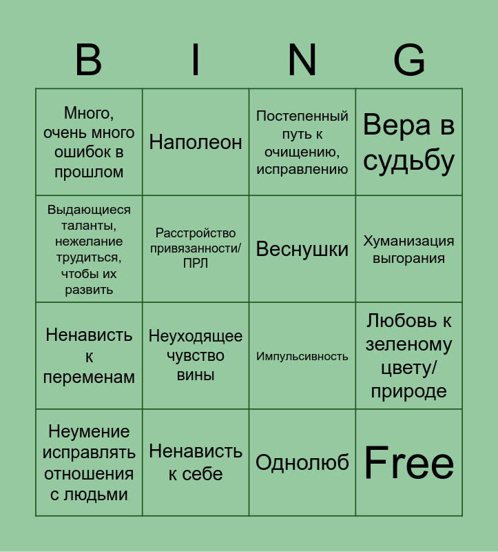 This bingo card has 16 words: Ненависть к себе, Любовь к зеленому цвету/ природе, Постепенный путь к очищению, исправлению, Много, очень много ошибок в прошлом, Ненависть к переменам, Наполеон, Импульсивность, Однолюб, Выдающиеся таланты, нежелание трудиться, чтобы их развить, Расстройство привязанности/ ПРЛ, Неумение исправлять отношения с людьми, Вера в судьбу, Неуходящее чувство вины, Хуманизация выгорания, Веснушки and Free.